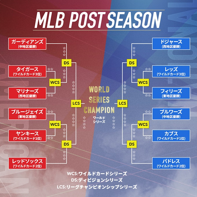 はい、話を戻して、MLBポストシーズンで行われる4シリーズには、下から順にワイルドカードシリーズ(WCS)、ディビジョンシリーズ(DS)、リーグチャンピオンシップシリーズ(LCS)、最後にワイルドシリーズ(WS)があります。
