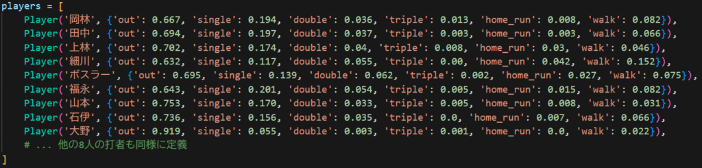 - 打者の打撃成績を各打席結果の確率とし、毎打席確率に従うようにした